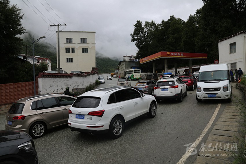87日上午9時(shí)10分,中石油康定市折多山加油站,左側(cè)加油進(jìn)車口排起了長龍,記者目測,在加油站進(jìn)口處,等待加油的車輛已排成三排,約有六七十米遠(yuǎn),當(dāng)時(shí)等待加油的車輛有43輛。排隊(duì)車輛占據(jù)了國道318線此路段一半路面,從折多山方向駛來的車輛很多,有部分車輛沒料到此路段有車輛占道,急忙放緩車速。