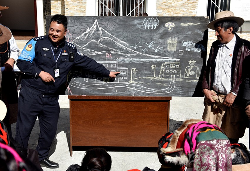 由于轄區(qū)藏族群眾大多都不識漢字、不會漢語,巴桑呷瓦便將自己的繪畫技藝運用到普法教育中,2018年10月,康定市公安局在對聯(lián)系鄉(xiāng)甲根壩開展精準(zhǔn)扶貧工作時,在全市范圍內(nèi)抽調(diào)了巴桑呷瓦等10名富有群眾工作經(jīng)驗的民警,他一邊負(fù)責(zé)沙德鎮(zhèn)派出所日常工作,一邊負(fù)責(zé)兼職扎日村精準(zhǔn)扶貧工作,用繪畫的方式為牧民群眾描繪脫貧致富夢。他把國家的相關(guān)法律法規(guī)、民族政策和惠民工程政策吃透并制作成故事性強、通俗易通的簡筆畫冊向老百姓解讀、宣講。在巴桑呷瓦妙趣橫生、詼諧幽默的“授課”下,深奧的法律政策變得淺顯易懂。“他的畫形象生動,接地氣,有我們的生產(chǎn)生活場景,我們喜歡看,他的講解幽默風(fēng)趣,我們聽得懂,只要他一下來,村民都圍在他的身邊,舍不得離開?!痹沾宓拇迕褚呀?jīng)把這位“畫家”警察當(dāng)作了自家人。