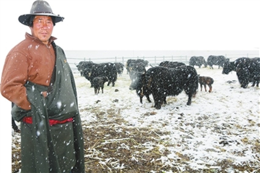 5月8日,甘孜縣達(dá)通瑪片區(qū)大雪飛揚(yáng)。在茶扎鄉(xiāng)銀多村集體牧場(chǎng),放養(yǎng)人員格絨正在給上百頭牦牛喂草料,他喜滋滋地說,通過牧民儲(chǔ)備和農(nóng)牧農(nóng)村局提供草料的方式,牦??梢园踩^冬。銀多村現(xiàn)代化集體牧場(chǎng)合作社成立一年多的時(shí)間,共出欄牦牛16頭,總收益67380元,除去20%預(yù)留金,村民有了一定的收入,而作為放牧人員,他管理了52頭牦牛,一年有1.2萬(wàn)元的收入。