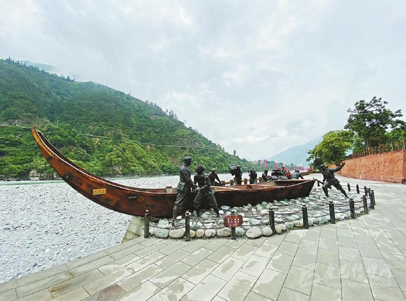 不遠(yuǎn)處的安順場渡口、大渡河邊,矗立著一座“紅軍渡”石碑,上面的三個(gè)鮮紅大字由渡河時(shí)任第一軍團(tuán)第一師一團(tuán)團(tuán)長楊得志題寫。石碑旁陳列著的一艘長10.5米、寬2.3米、高2.2米的“紅軍船”,正是當(dāng)年紅軍強(qiáng)渡大渡河時(shí)使用的翹首木船復(fù)制品。木船旁,是戰(zhàn)士和當(dāng)?shù)卮兿蚰敬\(yùn)送武器裝備的雕像,斜坡上,勇士隊(duì)伍正奔向渡口。