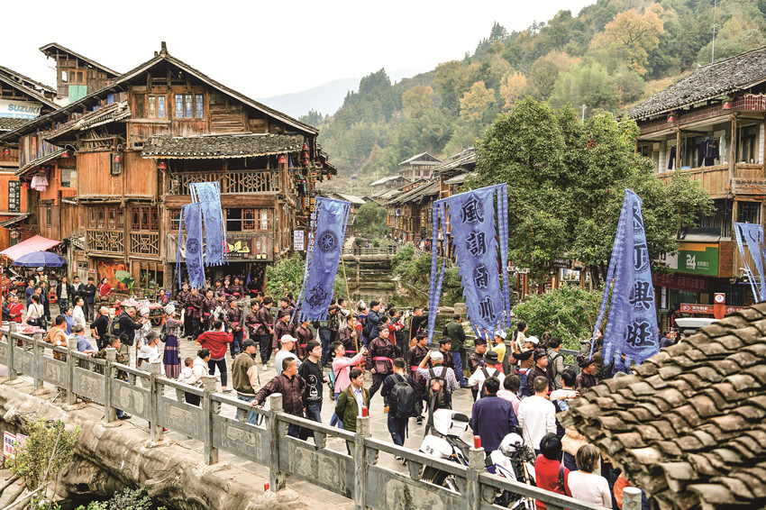在貴州省黎平縣肇興侗寨,侗族群眾身穿節(jié)日盛裝參加侗年巡游活動(dòng)。