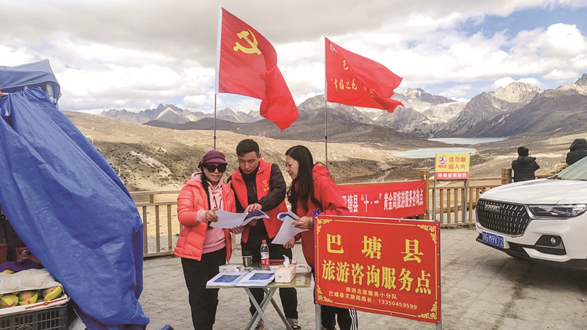 圖為在國道318線海子山觀景臺巴塘縣志愿者為旅客提供服務(wù)保障。