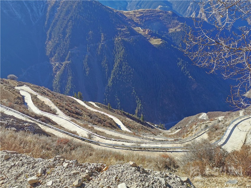 “然布村通村路路面寬4.5米、長7227米,總投資1084萬元?!毙慢埧h交通局工程師唐世楊介紹說,“整條路有數(shù)十個急彎道,比山路十八彎還復雜險峻,可以說是新龍縣最為‘陡、險、 急’的山路?!?/p>